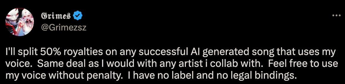 Several AI-generated songs have gone viral, featuring Drake, The Weeknd, and more pop artists. Their response? Ask the streaming services to take the songs down. This is reminiscent of the music industry's reaction when MP3s came out. Rather than embrace and figure out how to monetize new technology, they fight it. However, one artist is thinking about it correctly: Grimes announced a 50% royalty split with any successful AI song generated using her voice. Plus she later explained she would use blockchain tech to keep track of the contracts and payments.