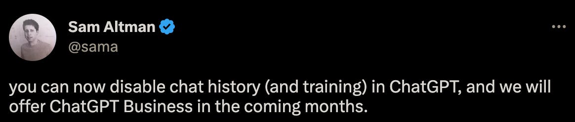 ChatGPT launches “incognito mode,” which allows you to disable chat history and allows ChatGPT to train models using your data. ChatGPT also announced the upcoming release of ChatGPT Business, although they were short on details about it.