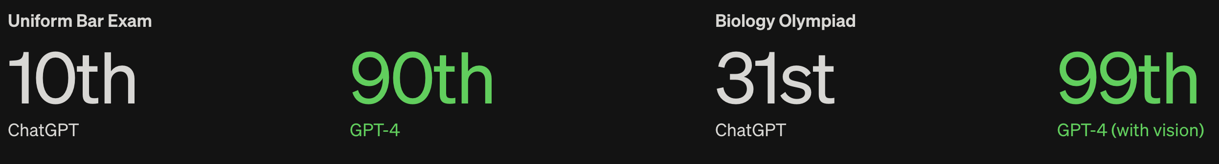 While GPT-3.5 “only” made it into the 10th percentile for the Bar Exam, GPT-4 was in the 90th percentile, meaning it performed better than 90% of humans in this incredibly difficult exam. For the Biology Olympiad, GPT-3.5 was in the 31st percentile while GPT-4 was in the 99th, performing better than 99% of humans!