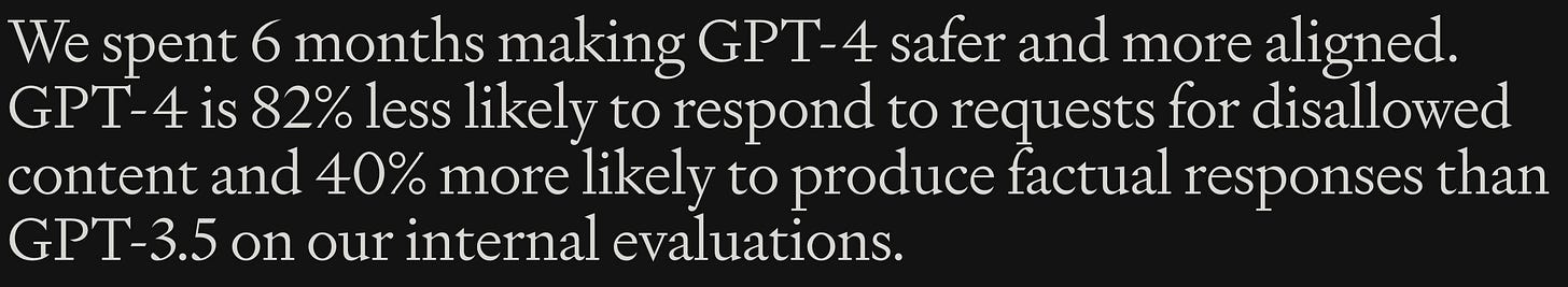 OpenAI spent a lot of time and resources on GPT-4’s safety. As we crawl (sprint?) towards AGI (artificial general intelligence), it’s clear OpenAI is prioritizing safety.